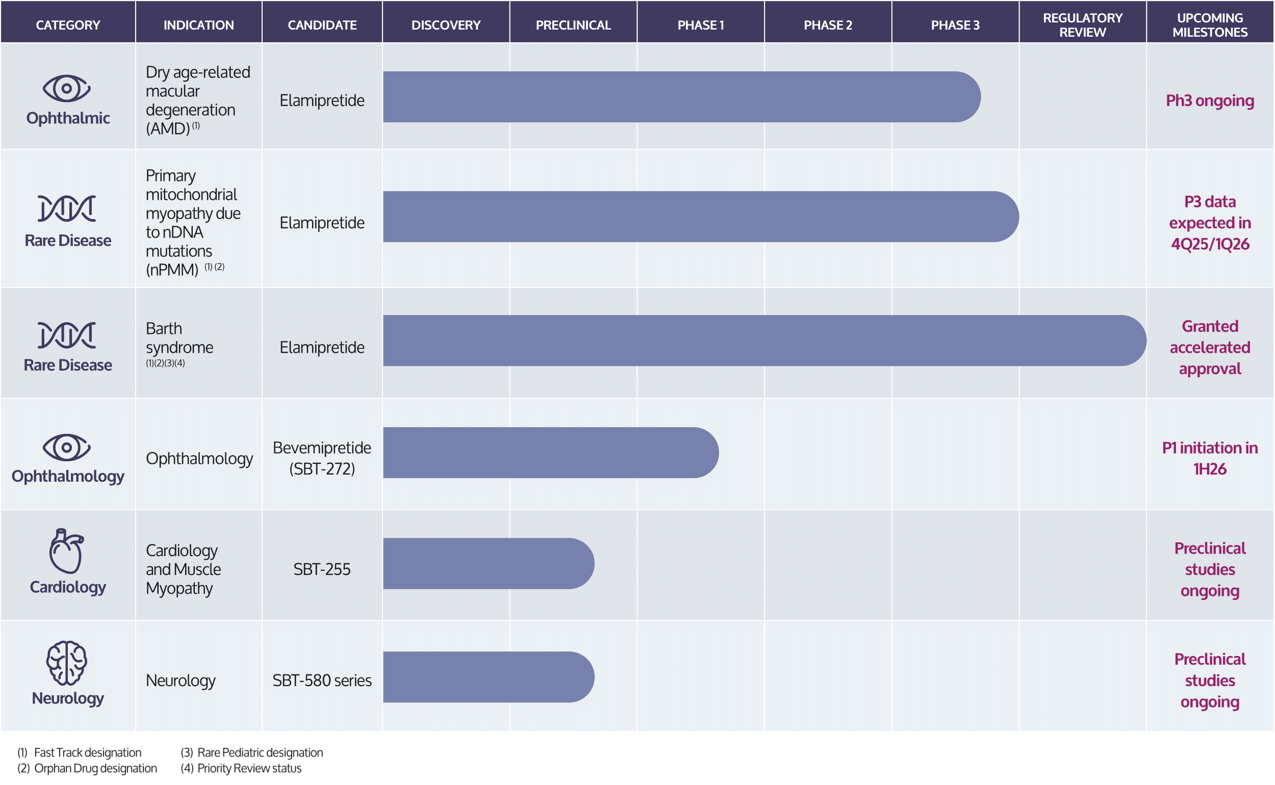Stealth’s lead investigational product candidate, elamipretide, is a peptide compound that readily penetrates cell membranes, and targets the inner mitochondrial membrane where it binds reversibly to cardiolipin.13 In preclinical or clinical studies, we have observed that elamipretide increases mitochondrial respiration, improves electron transport chain function and ATP production and reduces formation of pathogenic ROS levels.13-19 This elamipretide-cardiolipin association has been shown to normalize the structure of the inner mitochondrial membrane, thereby improving mitochondrial function.13 Functional benefit is achieved through improvement of ATP production and interruption and potential reversal of damaging oxidative stress.13 We are investigating elamipretide in late stage clinical studies in ophthalmic diseases entailing mitochondrial dysfunction, such as dry AMD, rare neuromuscular disorders, such as primary mitochondrial myopathy. We are evaluating our second-generation clinical-stage candidate, Bevemipretide (SBT-272), for rare neurological disease indications, such as amyotrophic lateral sclerosis, and have a deep pipeline of novel compounds under evaluation for rare neurological and cardiac disease indications.